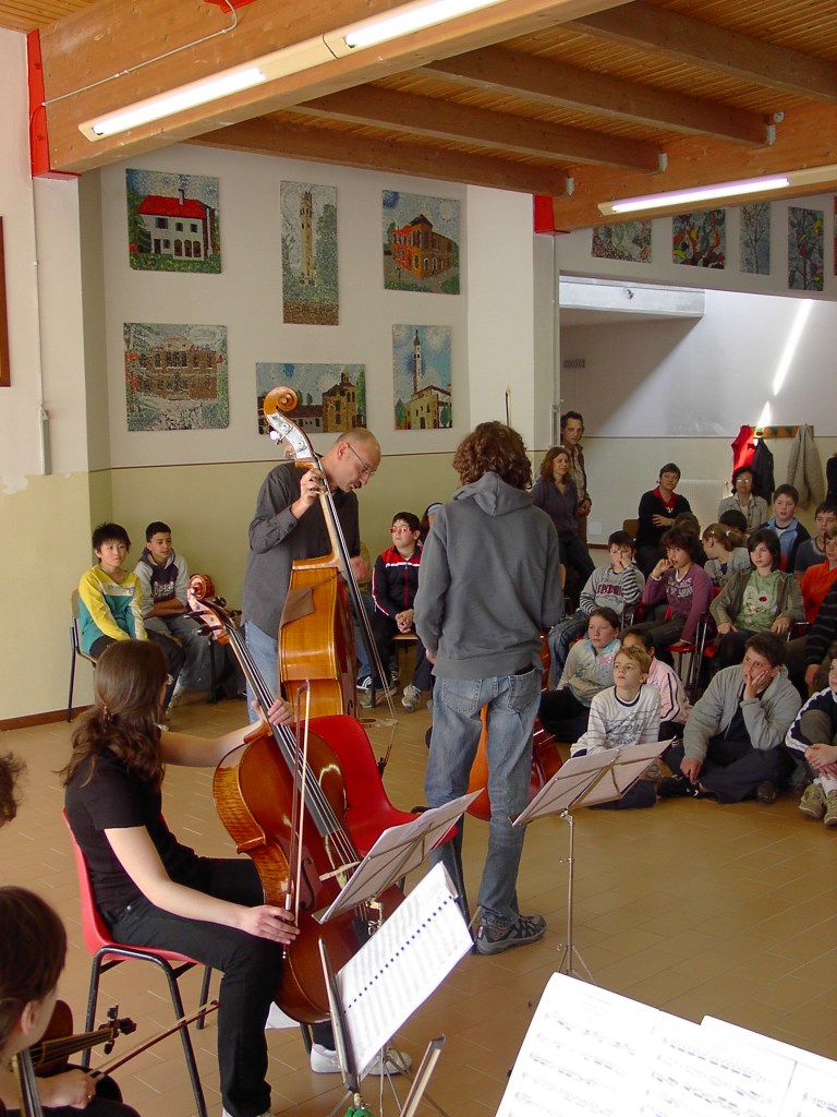 Lezione concerto del 7 aprile 2009-04-30 Il giorno 7 aprile 2009 si è svolta nell’atrio della scuola secondaria di 1° grado “E. Lovarini” di Spresiano una lezione-concerto della classe di musica d’insieme della scuola “M. Ravel” di Spresiano, diretta dall’insegnante Maria Luisa Barbon. Il concerto rivolto a tutti gli alunni (circa 200) delle classi prime e seconde della scuola ha visto alternarsi momenti di spiegazione sugli strumenti presenti (archi e flauto) ad audizioni di brani scelti del più classico repertorio culminate nell’esecuzione del primo tempo della “Piccola Serenata Notturna” (Eine Kleine Nachtmusik) K.525 di Wolfgang Amadeus Mozart. Applausi meritati, pubblico soddisfatto, un grazie agli esecutori ed un arrivederci alla prossima iniziativa musicale. Ecco alcune istantanee dell'evento (cliccare sull'anteprima per vedere la foto ingrandita).